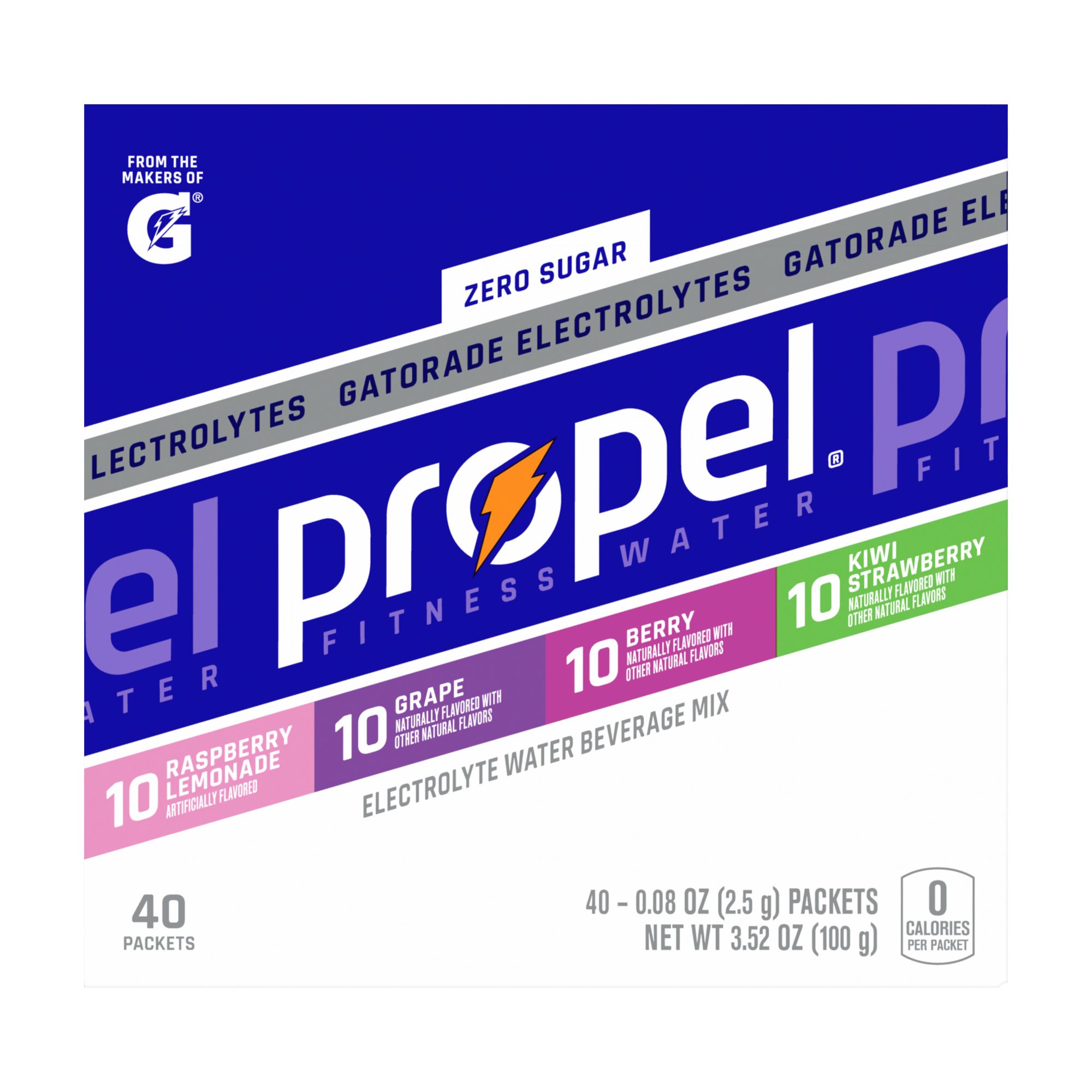 Gatorade-level electrolytes zero sugar plus vitamins and only 5. The Proper Electrolyte Water uses two types of sweetener-- sucralose and acesulfame potassium. Some of the dosage forms listed on this page may not apply to the brand name Propel.