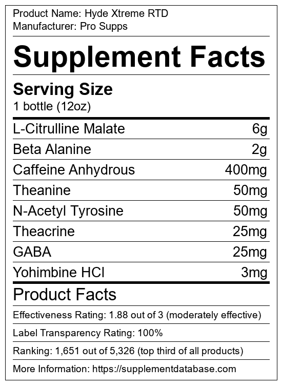 Pro Supps Hyde Pre-Workout 30 Servings Nutrition Facts Serving Size 1 Scoop Servings Per Container 30 Amount Per Serving Serving DV Strength Matrix 5g - Caffeine Matrix 419mg - Intensity Matrix 153mg - Focal Matrix 60mg - Proprietary Blends Strength Matrix Beta alanine Carnosyn 325g Creatine Nitrate NO3-T 1g L-Leucine 250mg L-Citrulline Apartate 11 250mg agmatine sulfate Agmapure. Prosupps Combines Test Boosting And Pre Workout In Mr Hyde. Hyde NitroX with 8 oz of cold water.