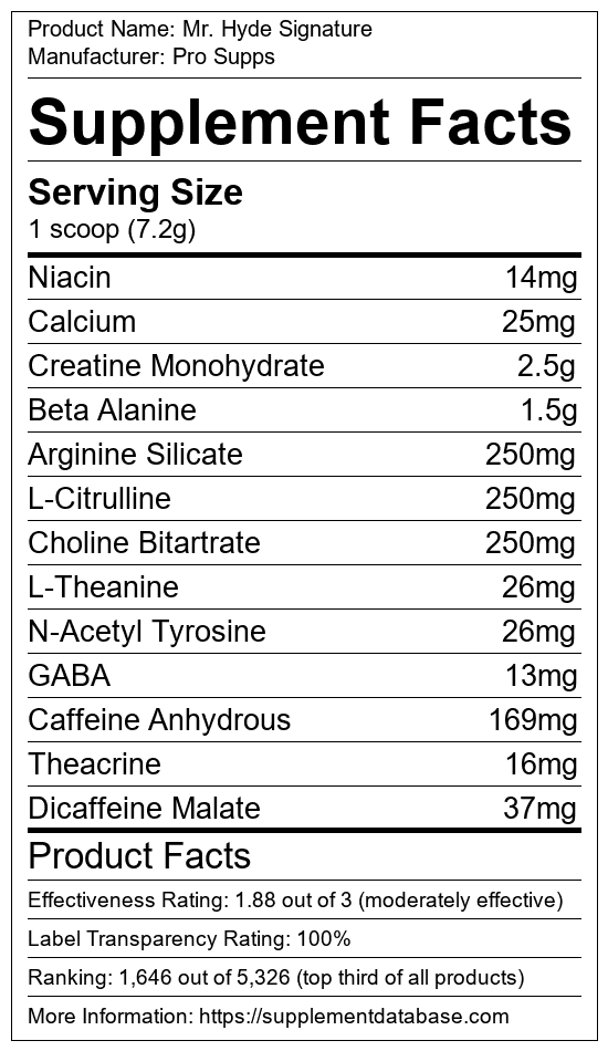 35 Hyde Pre Workout Label. Developed to be one of the best pre-workout experiences available Mr Hyde Signature series is formulated with 196mg caffeine 250mg Nitrosogine.